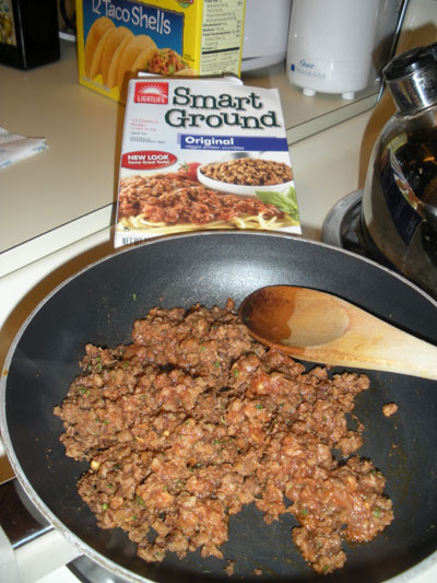 3) Add sliced vegetarian chorizo sausages and stir together.