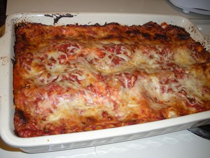 5) Place enchiladas side by side in dish. Cover evenly with sauce and